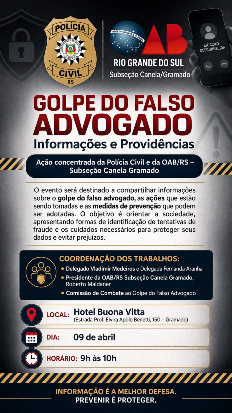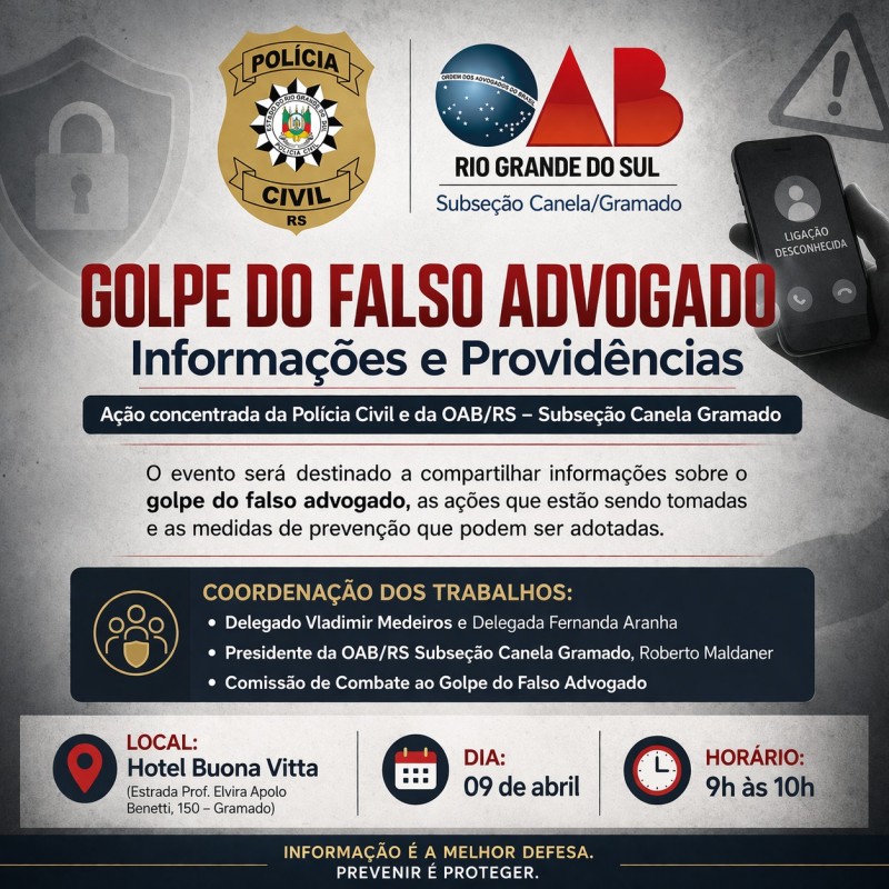 A Polícia Civil do Estado do Rio Grande do Sul, por meio da Delegacia de Polícia de Canela e da Delegacia de Polícia de Gramado, em conjunto com a Ordem dos Advogados do Brasil – Subseção Canela/Gramado, informa que realizará, no próximo dia 9 de abril, a partir das 9h, uma atividade conjunta, gratuita e aberta à comunidade jurídica, imprensa e comunidade em geral. O evento ocorrerá no Hotel Buona Vitta, em Gramado.