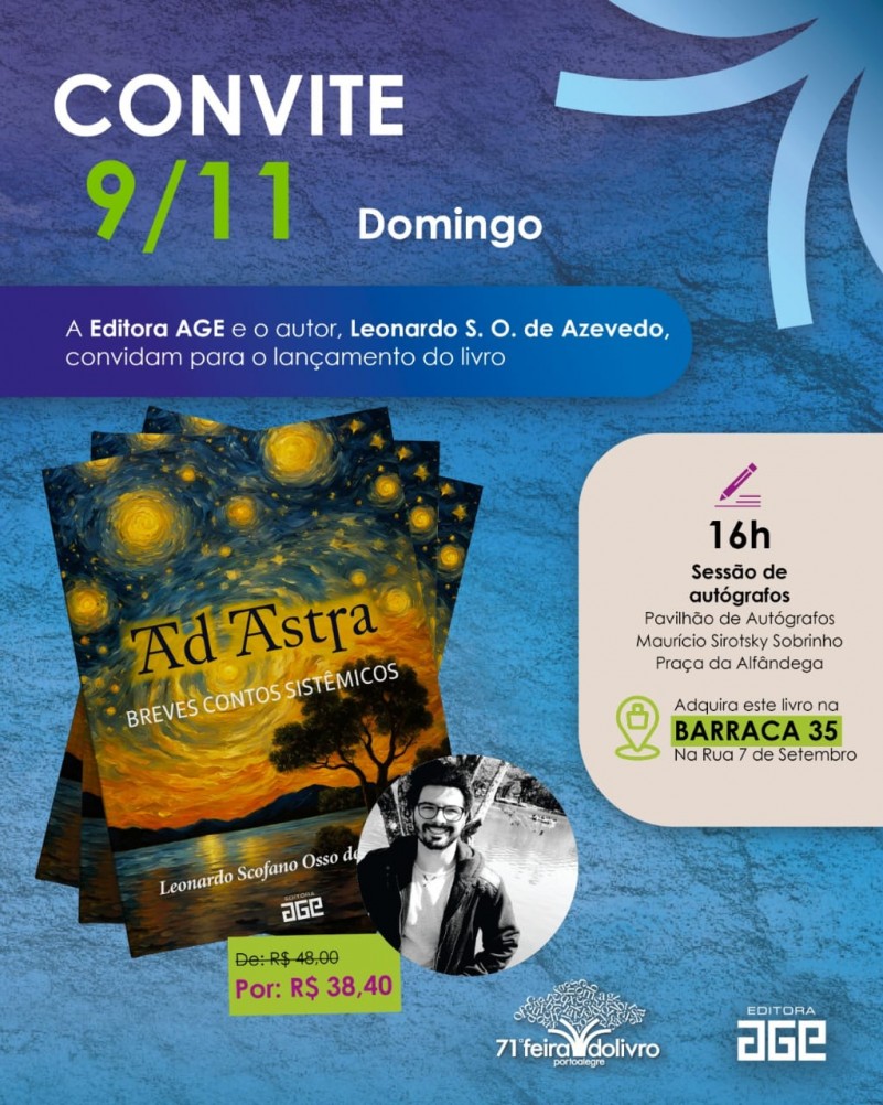 Neste domingo (09/11), o Delegado de Polícia, Leonardo S. O. de Azevedo participa da sessão de autógrafos sobre seu livro “Ad Astra, breves contos sistêmicos”, às 16h, na Rua Sete de Setembro, na barraca 35 da 71°Feira do Livro de Porto Alegre.