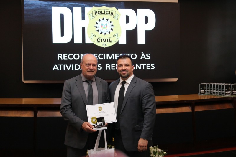 A Polícia Civil, por meio do Departamento Estadual de Homicídios e Proteção à Pessoa (DHPP), realizou nesta quarta-feira (26/11) a solenidade de entrega de homenagens em reconhecimento às atividades consideradas relevantes para o fortalecimento do trabalho do Departamento ao longo do ano. O evento aconteceu na Cidade da Polícia, em Porto Alegre, e reuniu autoridades, profissionais da segurança pública e representantes da sociedade civil.