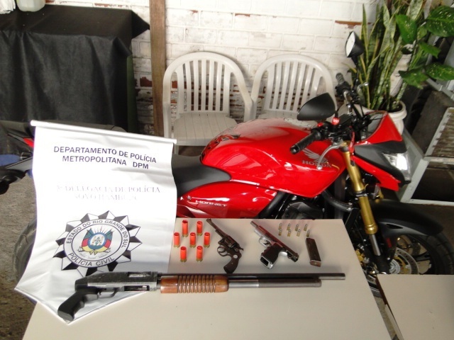 Policiais da 3ª Delegacia de Polícia (DP) de Novo Hamburgo prenderam em flagrante, nessa quarta-feira (19/02), uma mulher no Bairro Canudos, naquele município. Na residência dela a Polícia recuperou uma moto Hornet 600cc roubada no dia anterior na Avenida Victor Hugo Kunz, em Novo Hamburgo. No local também foram encontradas uma pistola 9mm, uma espingarda calibre 12 e um revólver calibre 32, todos municiados.