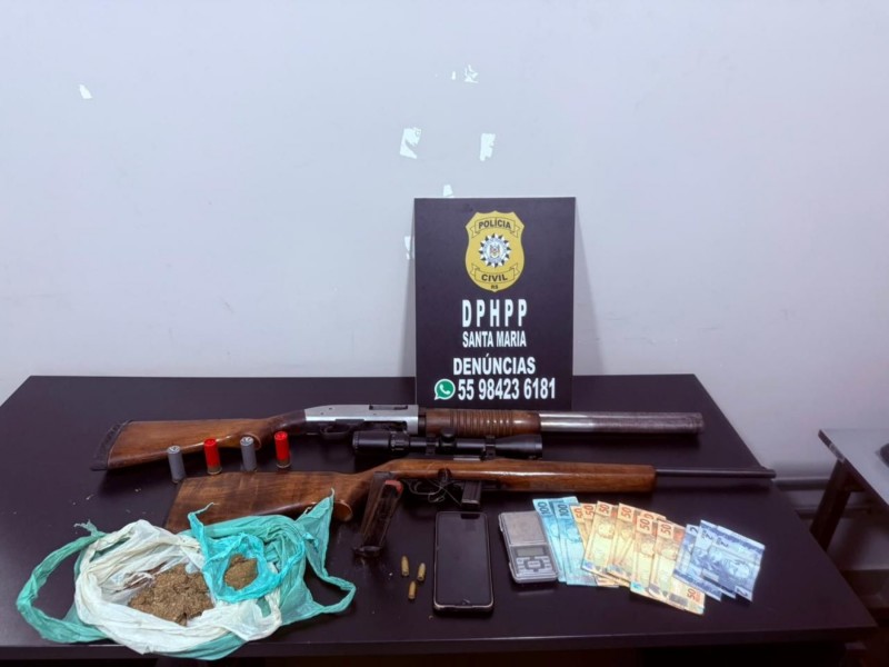 Foram apreendidos um rifle com luneta e calibre .22, drogas, uma espingarda calibre .12, uma balança de precisão, dinheiro, entre outros objetos.