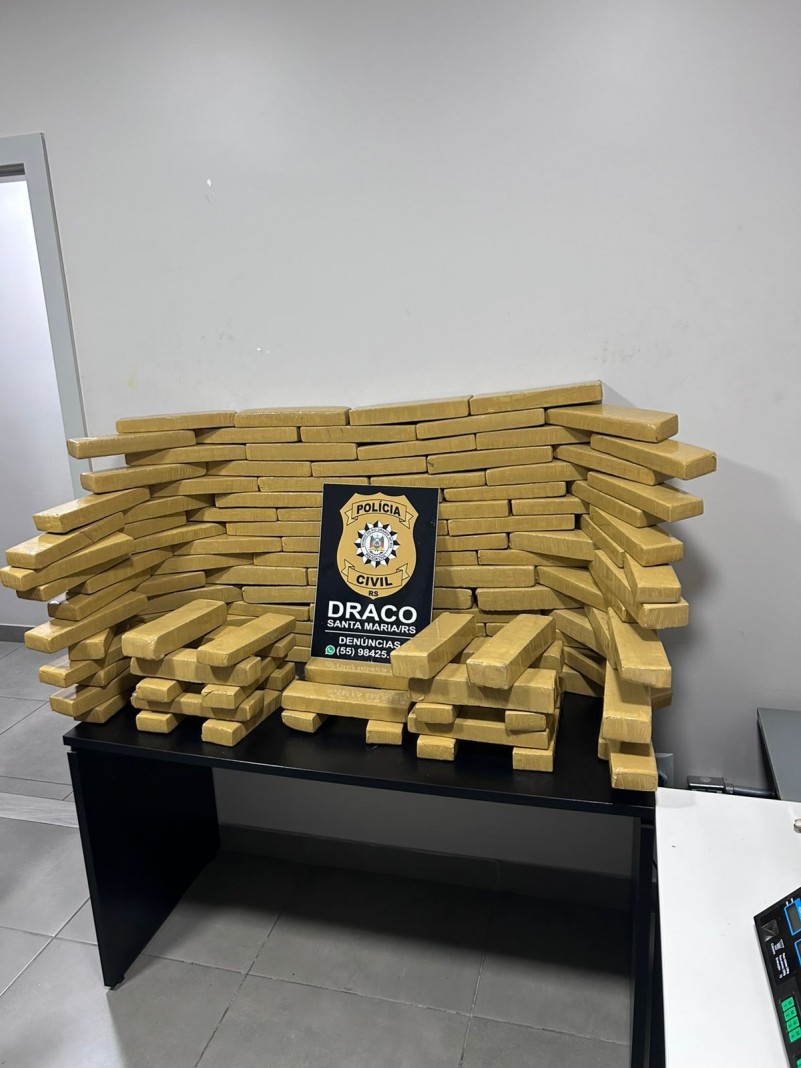 Após denúncia sobre veículo em deslocamento para Santa Maria transportando entorpecentes para o município, os policiais realizaram a abordagem, identificando o automóvel. Durante a revista veicular, foram encontrados diversos tijolos de substância semelhante à maconha. A droga estava escondida no porta-malas do veículo.