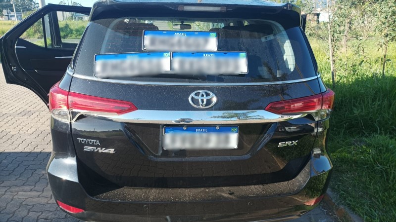 Um veículo de alto padrão foi apreendido na posse do investigado preso, além de placas de outros veículos.